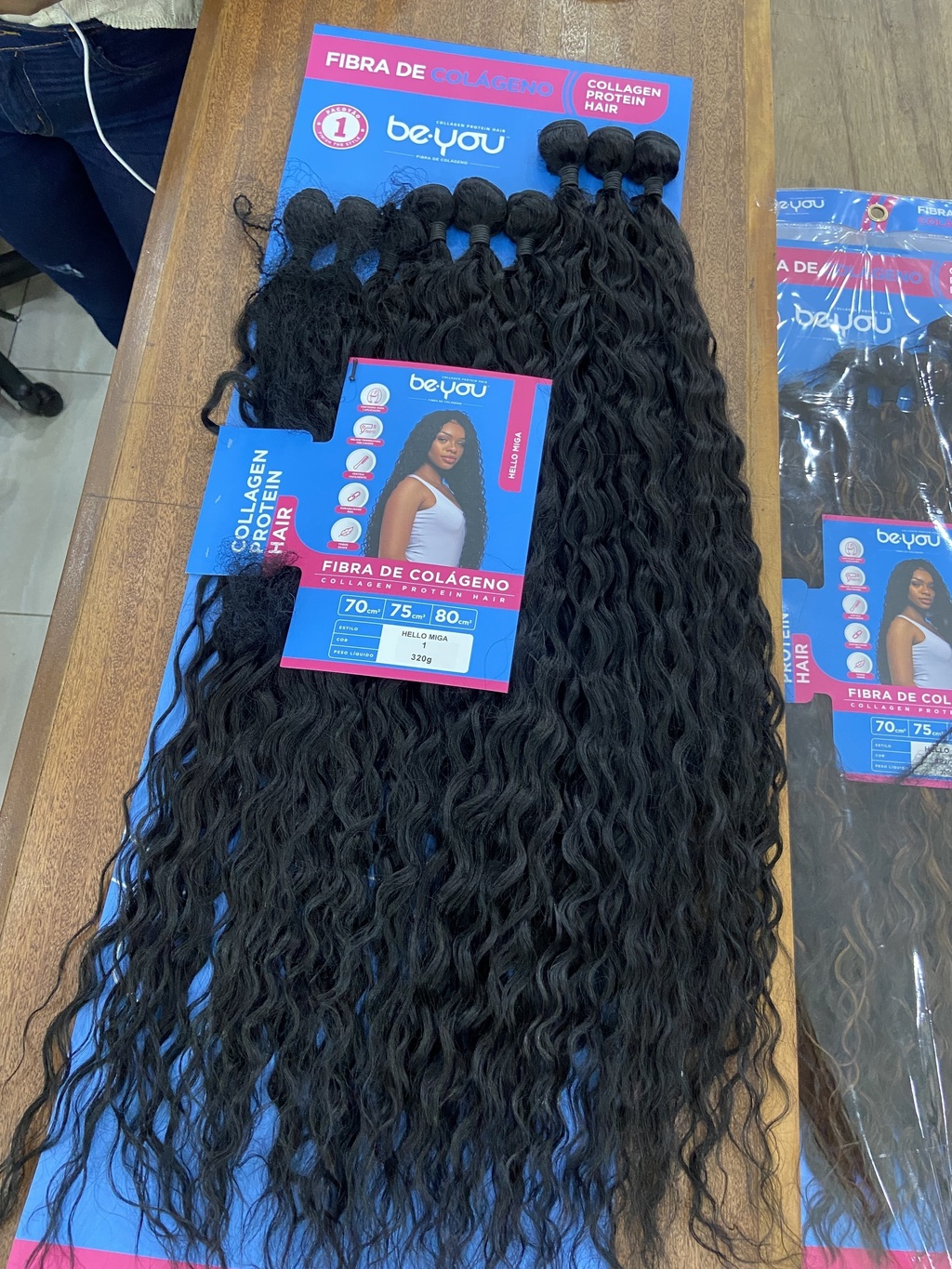 O cabelo HELLO MIGA-Be You tem curvatura ondulada. Ele é de fibra de Colágeno que permite a aderência de creme, pentear e suporta calor. Ele é ideal para entrelace, tendo em cada pacote 9 telas (70cm/75cm/80cm) que totalizam em 320g
